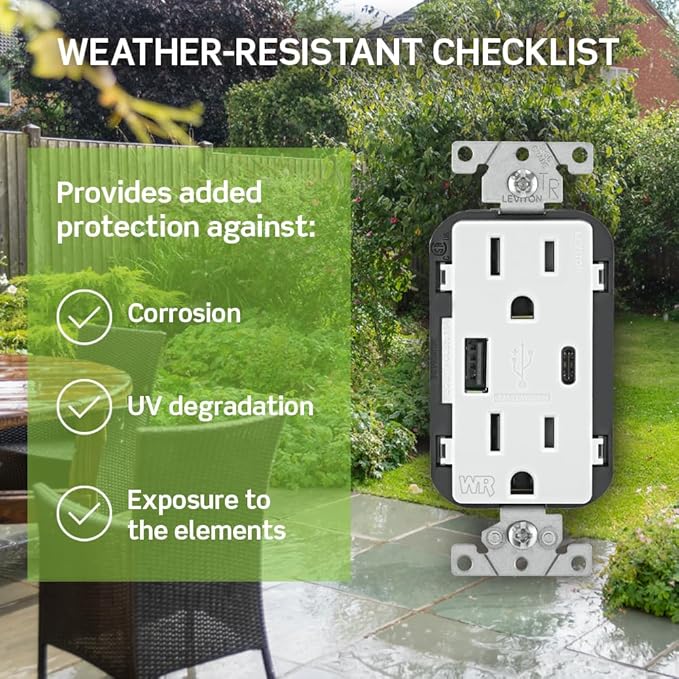 Leviton W5633-W Type A & Type-C USB In-Wall Charger with 15A Tamper-Resistant Outlet, Outdoor USB Charger for Smartphones and Tablets, Not for Laptops, White