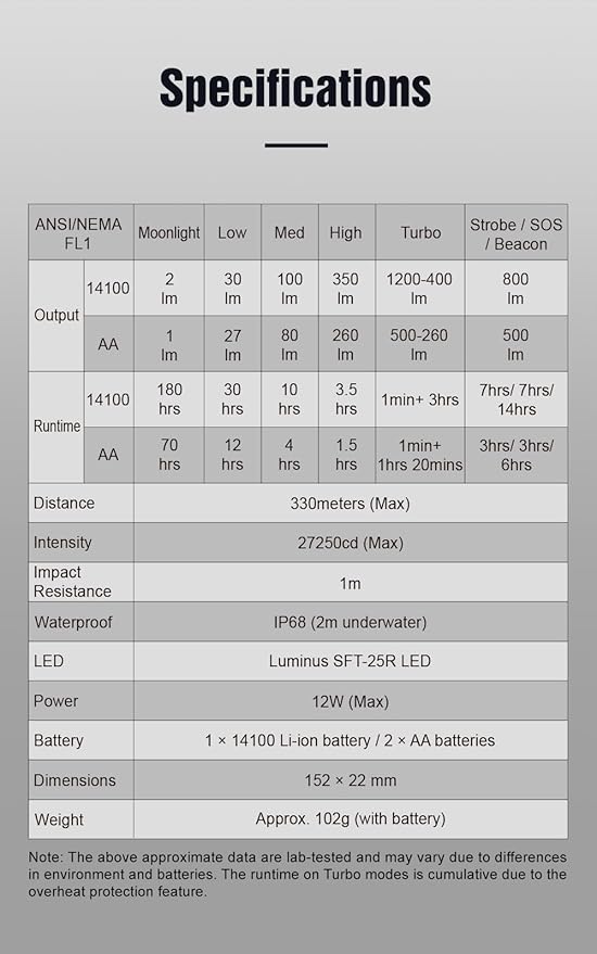 - DUAL MODES FOR EVERY NEED: P2A features Tactical Mode for instant 1200-lumen Turbo power with a 330-meter beam distance, activated by the tail switch, and Everyday Mode with 5 brightness levels (Moonlight to Turbo) plus emergency functions like Strobe, SOS, and Beacon. Perfect for both professional and daily use.