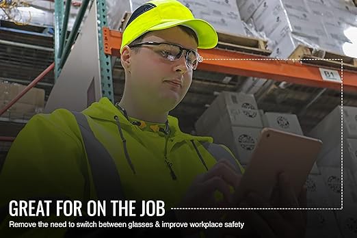 - SAFETY GLASSES WITH READERS – These bifocal clear safety glasses have a 2.5 magnification diopter positioned at the bottom inside of the lens. This protective eyewear feature improves workplace safety by removing the need to switch between glasses.