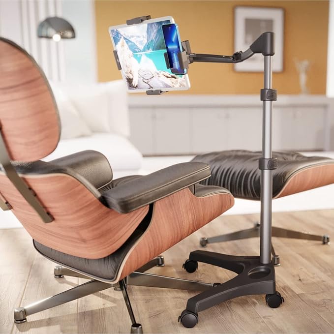 - PERFECTLY POSITION your tablet in total comfort while sitting, standing, or reclining. The 15 inch horizontal arm swings smoothly over and between the V-shaped feet of the base, making it ideal for use at the corner of chairs or with furniture that offers base clearance. Rotate, tilt, and yaw your tablet into perfect position. We engineered this LEVO to be lightweight yet super sturdy.