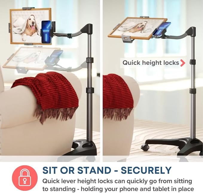 - SIT STAND ROLL. Raise it to standing height and lower it again for seated use with our quick-locking height adjustments. Your bed, couch, or favorite reading chair can now double as a workstation. Use it for hard-core or leisurely working. Either way, it makes your work mobile and removes the restrictions of being confined to one location in your home or office. At only 17 pounds, it’s light enough to carry from room to room yet sturdy enough for real work.