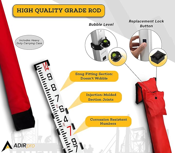 - PORTABLE AND CONVENIENT. The AdirPro Laser Level Grade Rod includes a durable soft carrying bag. Also, it is comfortable to carry with an adjustable shoulder strap.