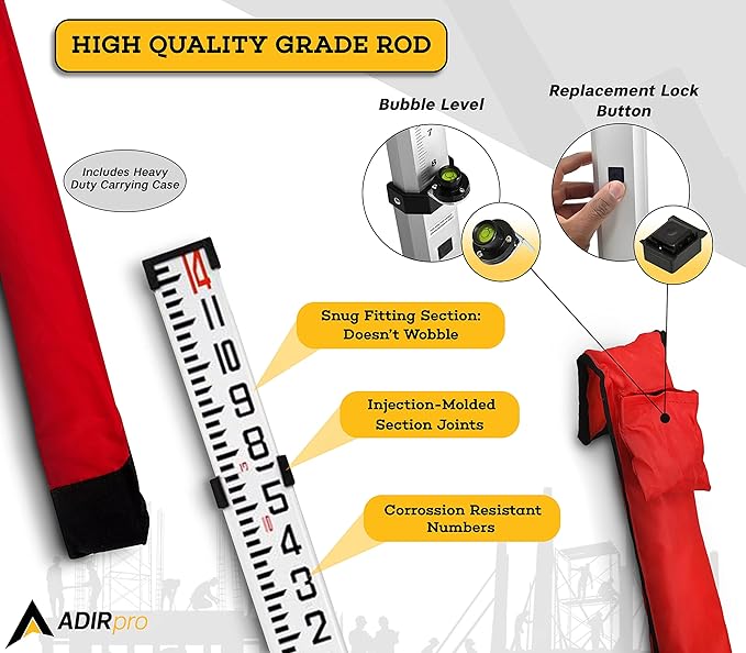 AdirPro 14-Foot Aluminum Grade Rod – 8ths, Dual Sided 5-Section Telescopic Leveling Rod – Bubble Level and Soft Carrying Case Included