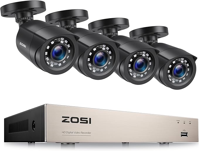 ZOSI H.265+ Home Security Camera System Outdoor Indoor, 8 Channel 5MP-Lite CCTV DVR Recorder and 4pcs Weatherproof Surveillance Bullet Camera,Night Vision,Remote Access,Motion Alerts (No HDD)