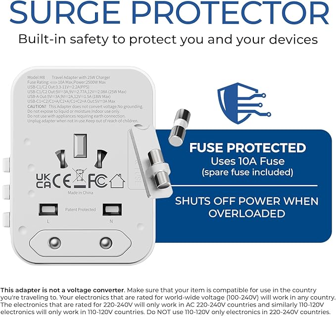 - Sleek White Design in the USA with Enhanced Safety Features: The OREI universal plug adapter all in one is crafted in the USA, prioritizing safety and reliability. Certified by RoHS, CE, and FCC, it includes surge protection, an 8A fuse (spare included), safety shutters, and a plug-lock system to safeguard you and your devices during international travel.