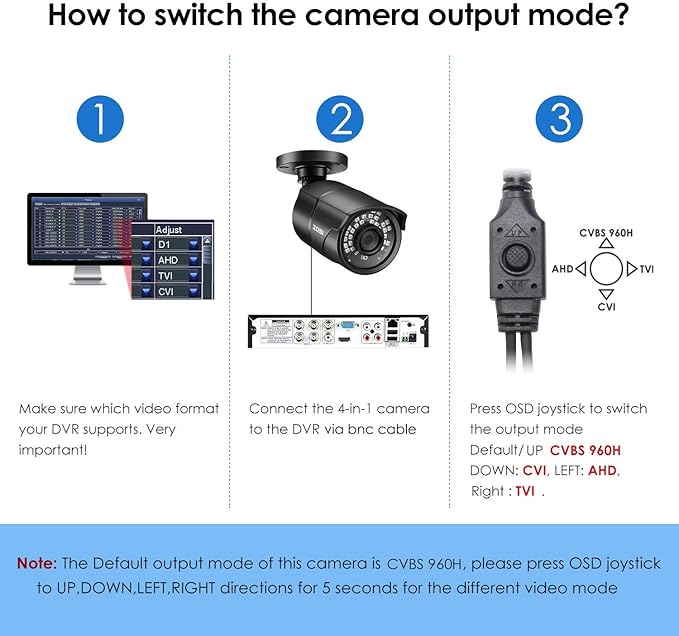 - 【Bulit in OSD Menu】-- It comes with OSD Menu which can change 4 different video output. 1080P AHD, 1080P CVI, 1080P TVI and 960H CVBS .Default Video mode is 960H mode, compatible with all analog DVRs. 1080P video mode must be switched according to your 1080P DVR type. Widely Usage: With OSD Menu, you can change signal mode freely and quickly in 5 seconds.