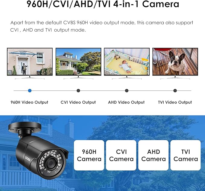 - 【2.0MP HD 1080P 4-IN-1 Security Camera】-- This is 4-in-1 TVI/CVI/AHD/CVBS Bullet Camera. compatible with 960H,720P,1080P,3MP,5MP,8MP,4K HD-TVI, AHD, CVI, and CVBS/960H analog DVRs.