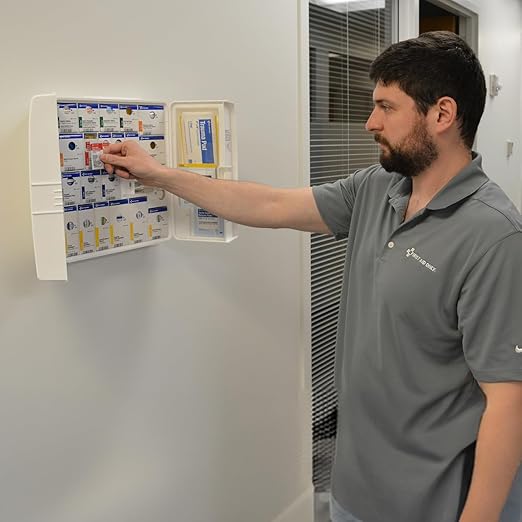 - Convenient Packaging: This large commercial first aid kit comes in a durable, wall-mountable plastic cabinet complete with an easy-to-carry handle for transporting first aid supplies in an emergency