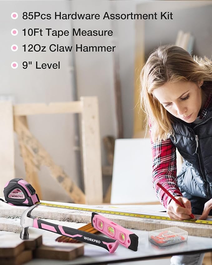 WORKPRO Pink Tool Kit - 236 Pieces Pink Tool Set with Easy Carrying Round Pouch, Household Tool Kit Perfect for DIY, Home Maintenance - Pink Ribbon