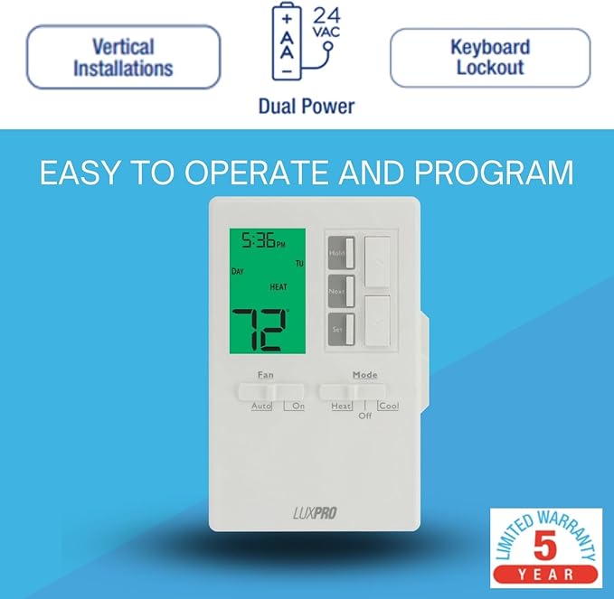 Lux Pro All in One Non Programmable and Programmable Thermostat; 7 and 5/2 Day Settings for Digital Energy Saving; Multi Stage Heating, AC Systems; Easy DIY, P711-Vertical, 1 Unit, Batteries Included