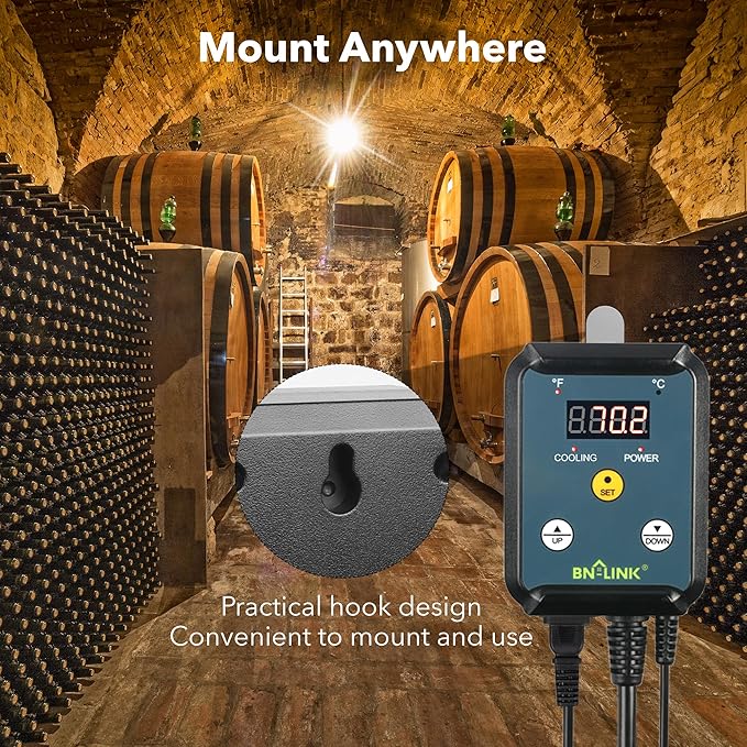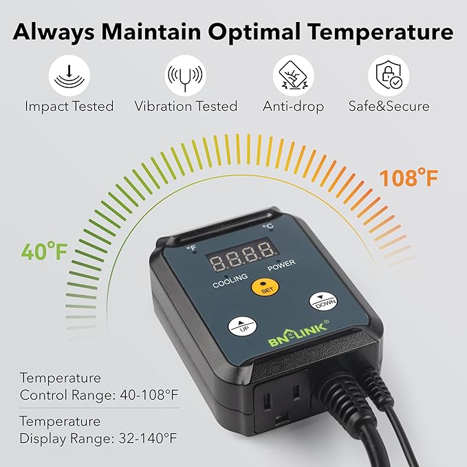 - EASE OF MIND: Handy LED cooling and power indicator lights allow you to see the controller’s status even in total darkness. BN-LINK cooling thermostat features a convenient hanging tab, and a bright, easy-to-read display inside a tough plastic housing