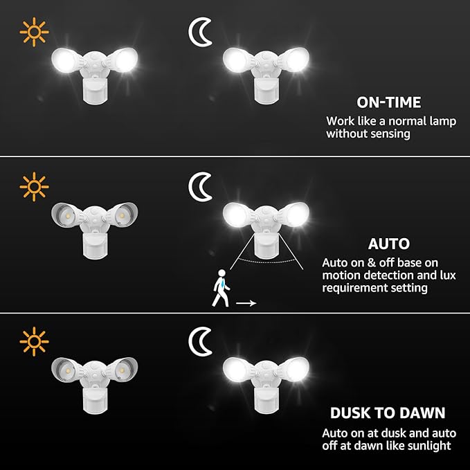 - Triple Operation Modes: Choose from three modes to fit your needs. On-Time mode offers manual control, Auto mode activates with motion at night, and Dusk-to-Dawn mode turns the light on at sunset and off at sunrise for hands-free security