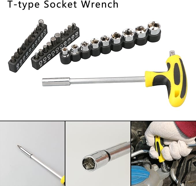 - COMPLETE VARIETIES: a combination of a variety of basic tools, screwdrivers, hammer, adjustable wrench, hex key sets, measuring tape, pliers, sockets set, bits set, a mini hacksaw frame and so on. Limited tools with unlimited functionality.