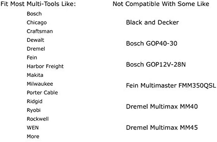 - Not Compatible with Bosch GOP40-30 / GOP12V-28N / Bosch Starlock 12V / 18V, Dremel Multimax MM30 / MM35 / MM40 / MM45 / MM50, Fein FMM350QSL and Black and Decker