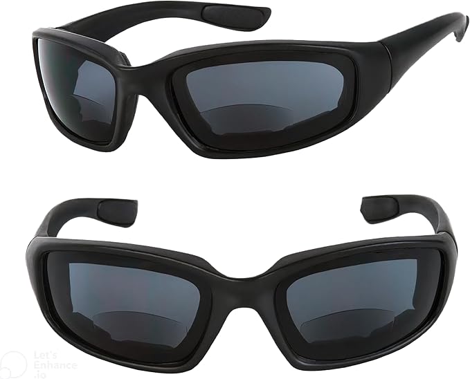 • Comfortable Secure Fit - These motorcycle bifocal reading sunglasses feature a wrap‑around frame with soft, vented EVA foam padding that seals against wind, dust, and debris for a snug and secure fit during rides. The foam layer also adds comfort against helmet pressure and prevents fogging from wind chill. Riders report that the snug fit eliminates movement even at highway speeds.