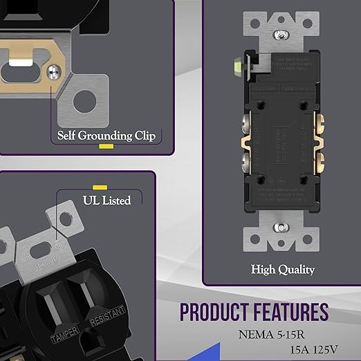 - Complies with 2017 NEC, Article 406.12 for tamper-resistant receptacles. 15A 125V, 5-15R, self-grounding, 2-pole, 3-Wire. UL94, V2 Rating, 1-year warranty, UL Listed