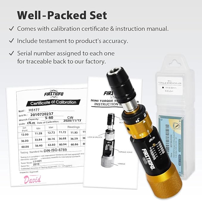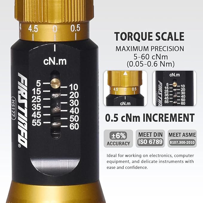 FIRSTINFO H5177 Ultra Precision Certified Torque Limiting Screwdriver 5-60 cNm (0.05-0.6 Nm), 1/4 Inch Universal Hex Quick Release Bit Holder
