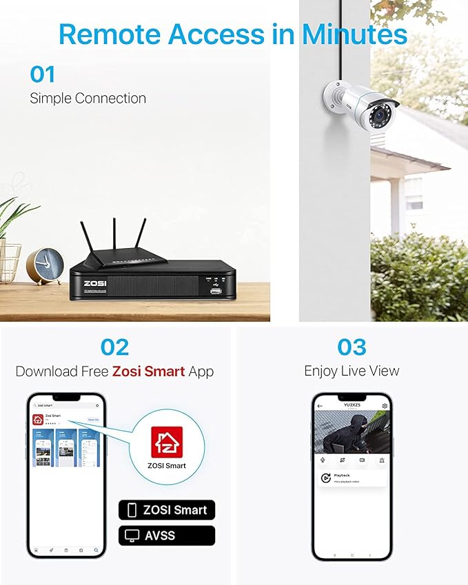 - (3). [ Local or Remote Access, Playback Anytime & Anywhere ] __ View and control your security system locally by connecting the system to a monitor without internet, or via free ZOSI Client software on tablet, PC, or via Smartphone APP (ZOSI Smart ) on mobile devices remotely.You can also playback significant evidence or funny videos records by searching different days, hours or minutes.