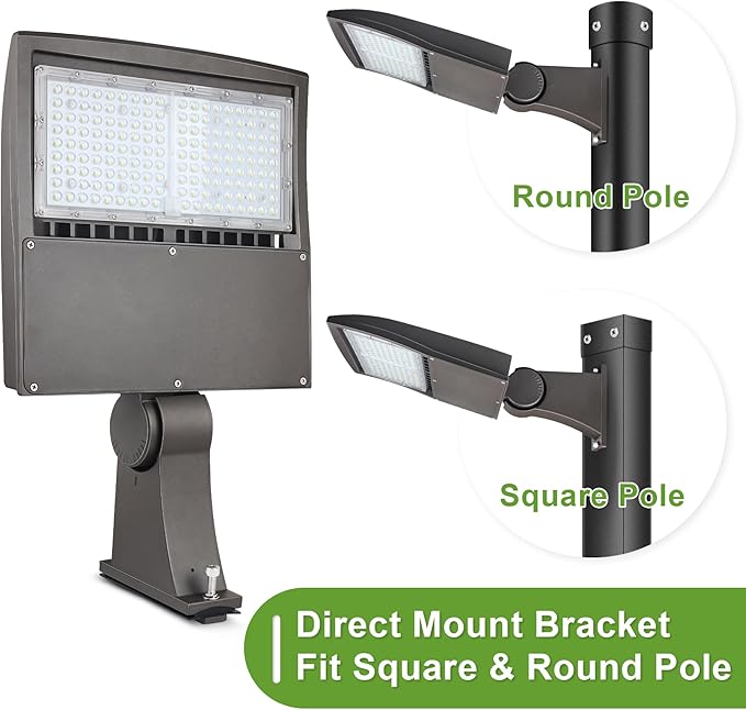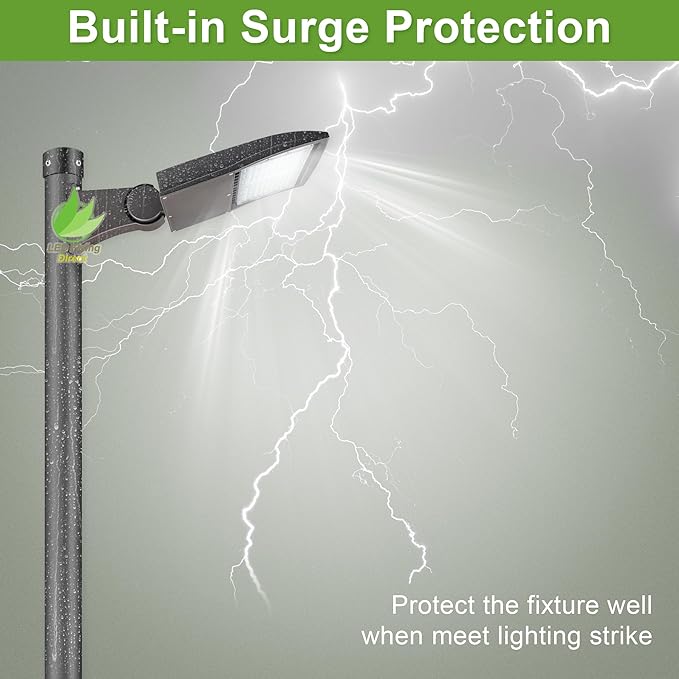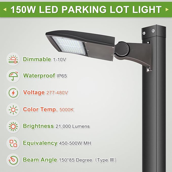 - Better Design: This 480V 150w LED shoebox parking lot light includes a built in 20KV surge protector for lightning protection, Comes with an adjustable direct arm mount for square or round poles. The light angle is easily adjustable, ideal for vertical or horizontal mounting