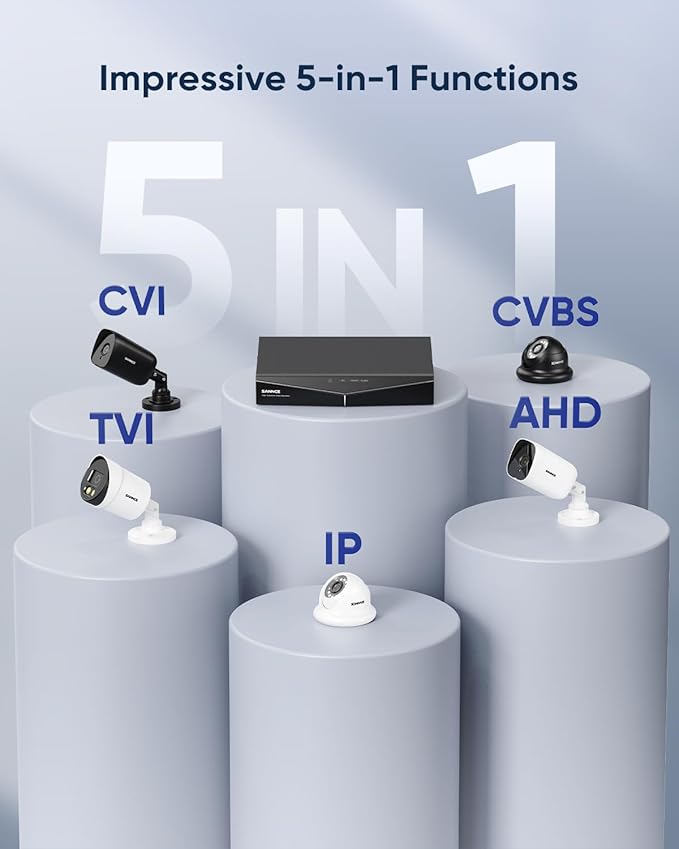 - Dynamic 5-in-1 DVR: Capable of utilizing five different connection modes, this powerful DVR is prepared for virtually anything. Supporting analog, CVI, AHD, TVI, and IP cameras, you’ll have more flexible connection options, and a more modifiable security system.