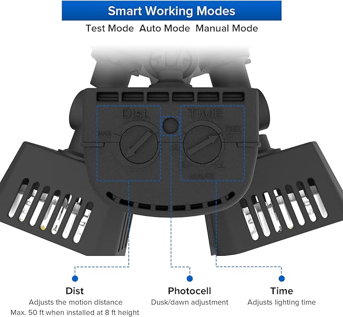 - AUTO ON AND OFF: Dusk-to-dawn photocell activates at nightfall and powers off in the daylight. Auto-on when motion is detected in the night, auto-off after pre-determined time when no further motion is detected. There will be NO "false" detection with this light. Sensing light levels and motion are with a range of 180 degrees and out to 50 feet when being wall mounted 8 feet high.