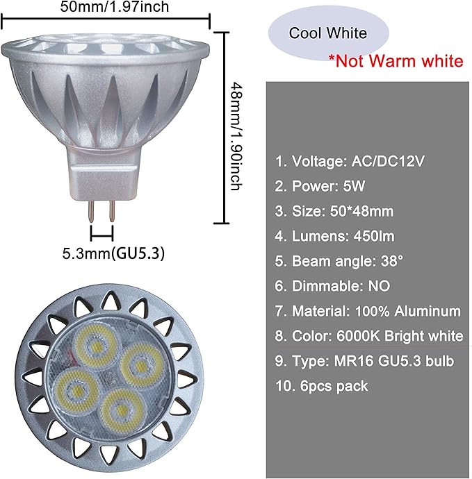 - Special Feature : 6000K cool white, very bright to replace 20w,35w,50w halogen, MR16 standard size, gu5.3 base, (AC/DC10-18V)12v low voltage bulbs for outdoor landscape & indoor track recessed ceiling lighting 6000K cool white, very bright to replace 20w,35w,50w halogen, MR16 standard size, gu5.3 base, (AC/DC10-18V)12v low voltage bulbs for outdoor landscape & indo… See more