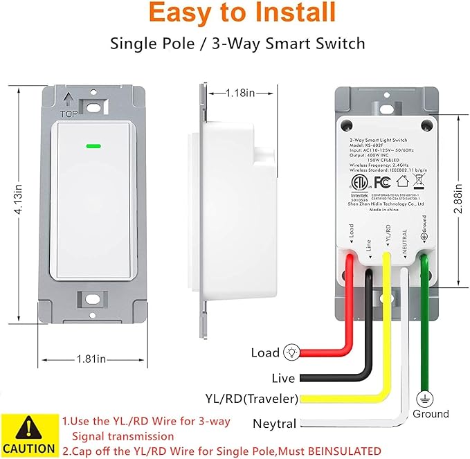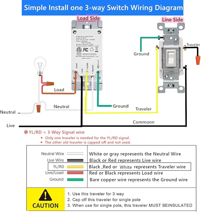 - Newest 3-Way Smart Switch Design – Flexible solution for Single Pole, 3-Way, or 4-Way circuits (by replacing one 3-way). For load-side installs without a hot feed, use one traveler to supply line power and the other to connect with the YL/RD 3-way signal terminal.
