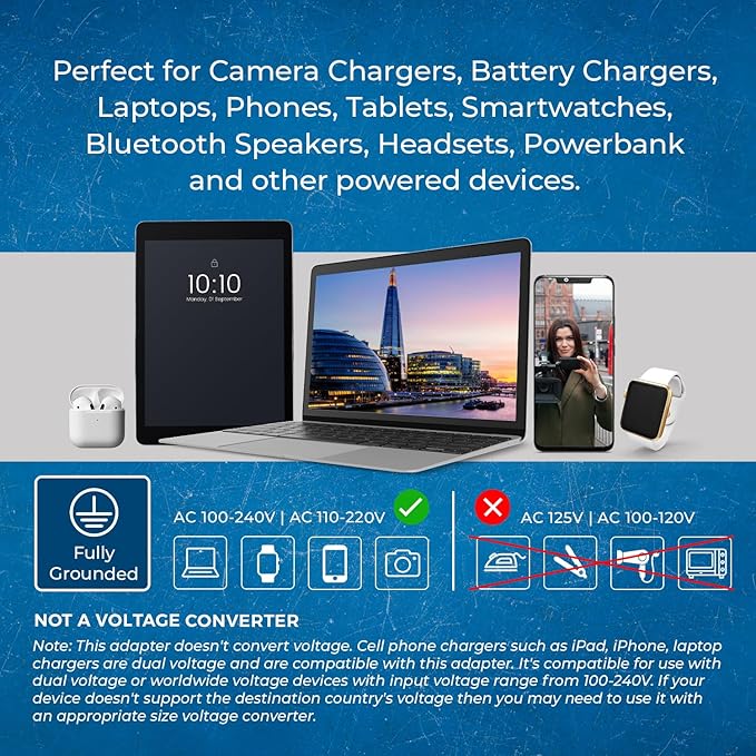 - Important: This is just a travel adapter, it will not work with devices that require a voltage converter. It will only work with dual voltage products such as cell phones, chargers, & laptops etc