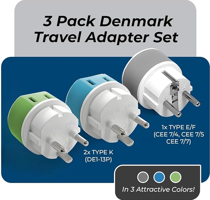 OREI Denmark Power Plug Adapter with 2 USA Inputs - Travel 3 Pack - 1 Type K & 2 Type E/F Safe Grounded Use with Cell Phones, Laptop, Camera Chargers, CPAP, and More