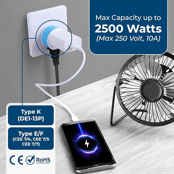 - One Outlet adapter Type K Plug & Two Outlet adapter Type E/F - works in countries such as Denmark