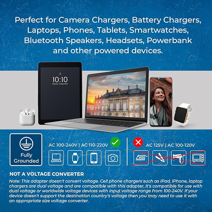 - Important: This is just a travel adapter, it will not work with devices that require a voltage converter; It will only work with dual voltage products such as cell phones, chargers, & laptops etc.