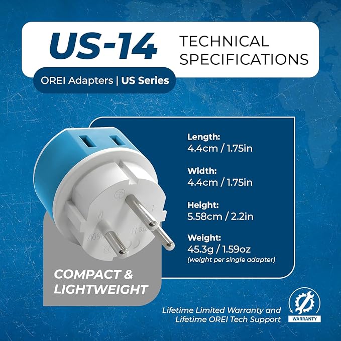 OREI Israel, Palestine Power Plug Adapter with 2 USA Inputs - Travel 3 Pack - Type H (US-14) Safe Grounded Use with Cell Phones, Laptop, Camera Chargers, CPAP, and More