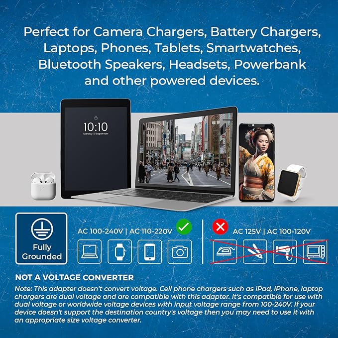 - Important: This is just a travel adapter, it will not work with devices that require a voltage converter. It will only work with dual voltage products such as cell phones, chargers, & laptops etc.
