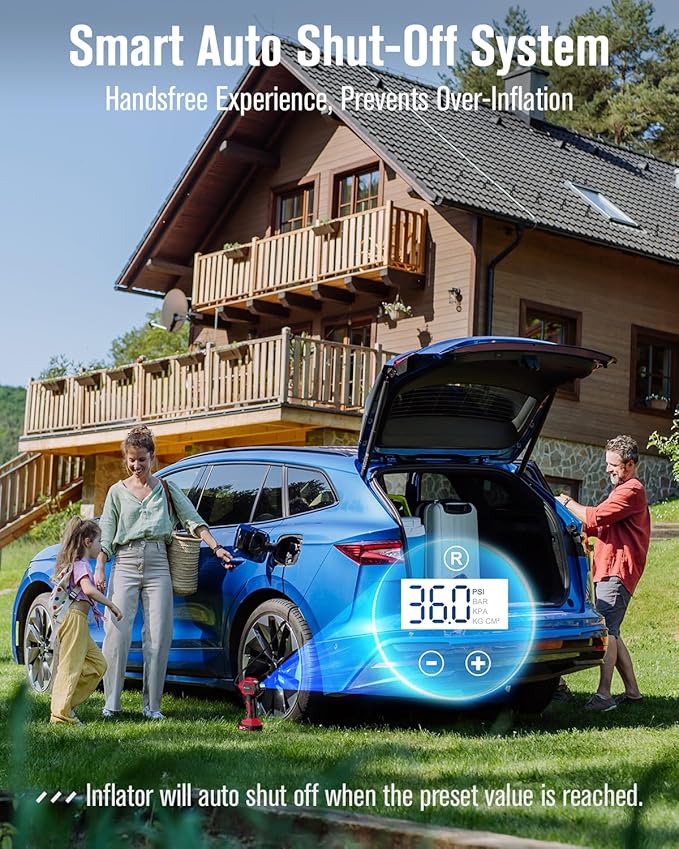 - [Auto Shut-off & Fast Inflation] This car air pump ensures a worry-free experience with its auto shut-off feature. Simply set your desired pressure, start inflating, and the car air compressor will automatically stop once it reaches the right level - no more overinflating. With a rapid 30 LPM airflow, it can inflate a flat 195/60 R14 tire to 36 PSI under 3 minutes or a 215/60 R16 tire to 36 PSI under 5 minutes. Quick tire top-ups are easy
