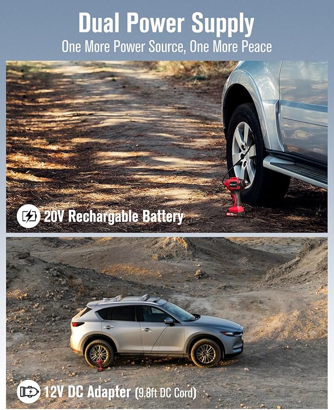 - [Dual Power Supply for Maximum Flexibility] Powered by a 20V rechargeable Li-ion battery or a 12V DC adapter (with a 9.8ft cord), this portable tire inflator for car gives you options. Never stress about a dead battery on the road—just plug it into your car’s 12V outlet for uninterrupted use. Perfect for roadside emergencies