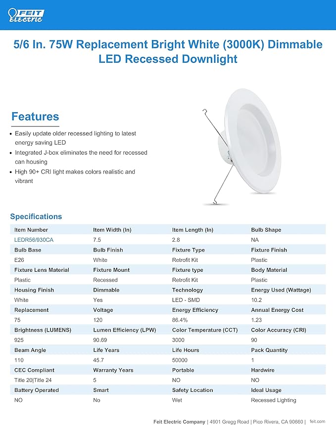 - ✔ ENERGY SAVING: Feit Electric LED recessed light provides up to 86.4% energy saving by replacing 75W with 10.2W; replace your old incandescent bulbs for a brighter and more energy-friendly home