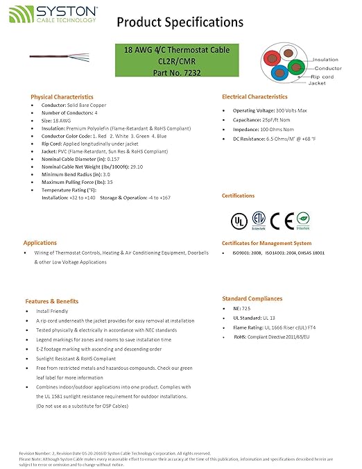 Syston 18/4 Thermostat Doorbell HVAC Heating Control Cable Wire, 100% Solid Copper Conductors CL3R/FT4/CMR Riser-Rated UL/ETL Listed, UV Resistant RoHS for Indoor/Outdoor Low Voltage Applications Use