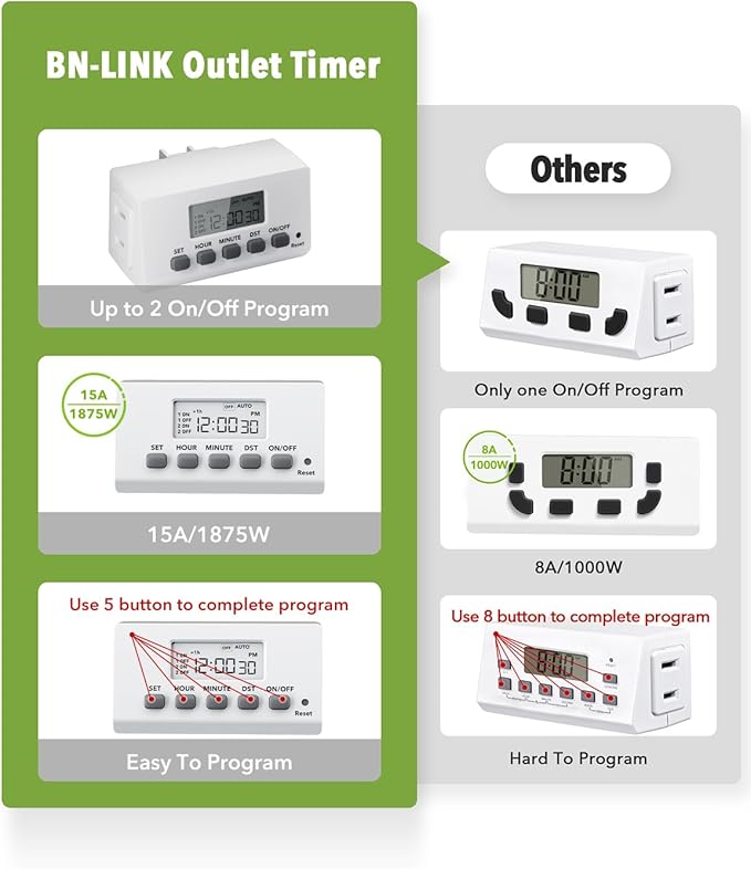 - ✓ DAYLIGHT SAVING & BACKUP BATTERY: Daylight Savings mode and Daily Repeat bring you great convenience. Long-lasting backup battery keeps your settings even in the event of a power outage. BN-LINK digital timer outlet deserves to trust.