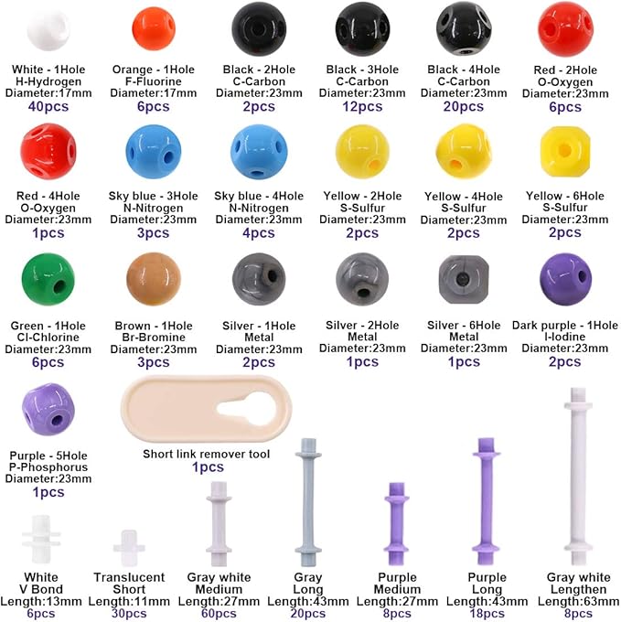 - ★ WHAT YOU GET --- Swpeet brings you this terrific 267-piece molecular model set! Each molecular model kit comes with 116 atom pieces made up of different elements. Also included are 150 links: long flexible ones (good for double and triple bonds), medium-length hard links, and two types of shorter space-filling links. Easily separate atoms from the links with the included removing tool.