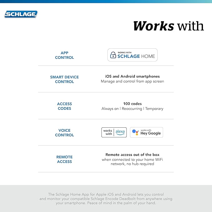 - ANYWHERE ACCESS: With built-in WiFi compatibility, you can easily and securely connect your Schlage Encode Deadbolt to your home WiFi network to control and monitor your home from anywhere with the Schlage Home app