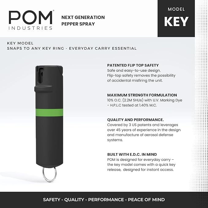 - PEPPER SPRAY TRUSTED BY ELITE TRAINERS ACROSS THE NATION: POM leverages over 40 years of industry experience in the manufacturing of aerosol defense products to bring the safest and easiest-to-use self-defense product on the market.