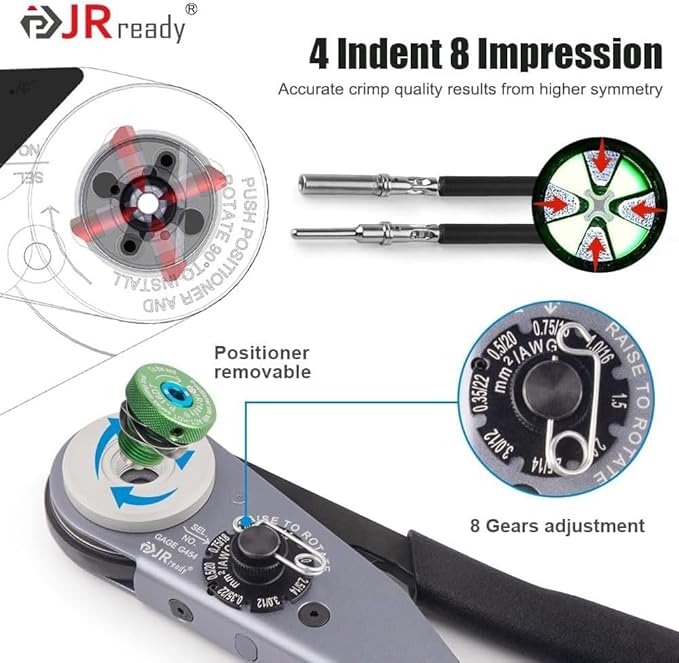 - 4/8 Indent Crimp: JRready ACT-HDT crimper produces a 4 indent 8 impression crimp configuration which provides maximum tensile strength for Deutsch DT DTM DTP series solid contacts when used with wire of various compositions. The high symmetry of the 4 indent crimp ensures a more accurate and stable crimp, making every crimp the best.