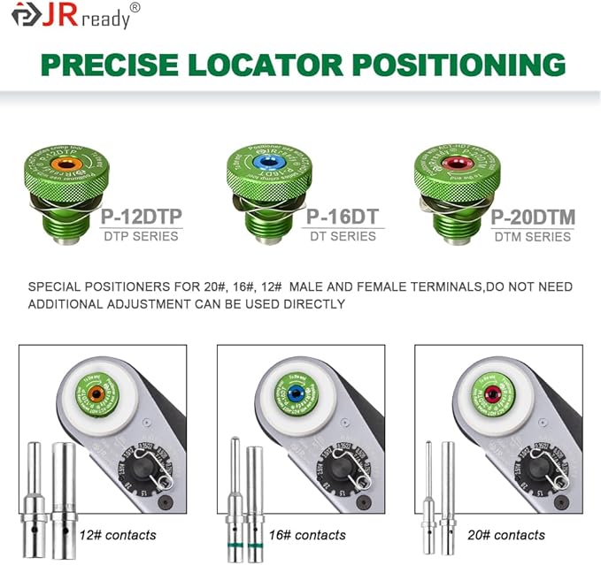 - Positioner: With three Replaceable special locator for different Deutch terminal (12# terminals/16# terminals/20# terminal), it is used to position contacts horizontally and vertically between the dies of the tool to ensure the accuracy and consistency of the crimp position.