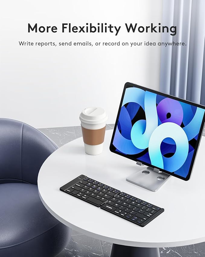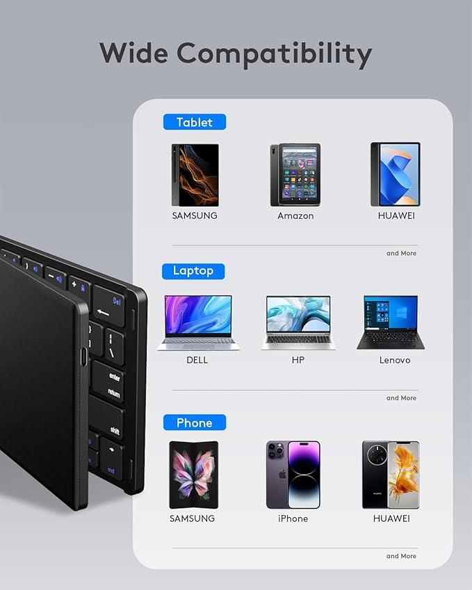 - 【Bluetooth Foldable Keyboard】 Portable folding keyboard with phone holder allows you to work anywhere, anytime! Standard-size design provides accurate, fast typing, just like the desktop keyboard you are used to. Quiet keys allow you to focus on your work. Perfect for travel and business trips.