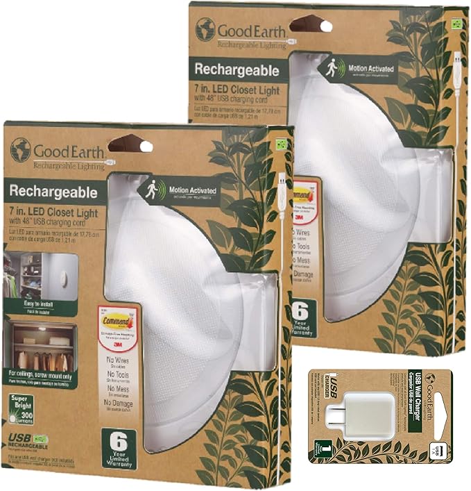 Good Earth Lighting Rechargeable LED Tap Lights (2-Pack) 7-Inch White Round Closet Light, Motion Sensor, 300 Lumens, 4000K, Auto Timer with Command Strips by 3M for Damage Free Mounting, USB Charger