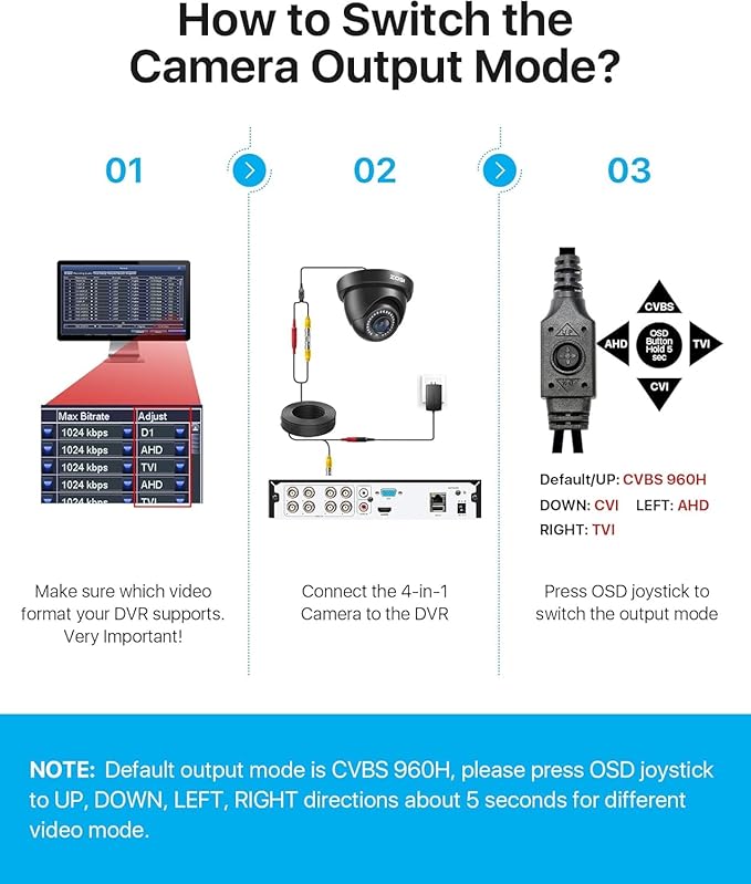 - 【4 mode video output】-- - 1080P AHD, 1080P CVI, 1080P TVI and CVBS. Default video mode is 960H mode, compatible with all TVI DVRs. Other video mode must be switched according to your DVR type. Widely usage: with OSD button, you can change signal mode freely and quickly in 5 seconds.