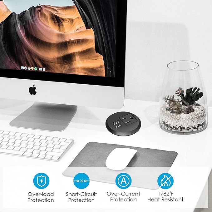 - ETL Listed:in-desk power outlet with Fire-resistant outer shell and built-in safety system provides you and your devices with complete protection.