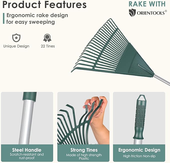 - REINFORCED 22 TINES RAKE: This leaf rake is made from a strong PP head with 22 rake teeth, each of which is reinforced. This is a durable leaf rake. It won't snag leaves during your gardening work, which makes it easy to collect leaves and other debris.