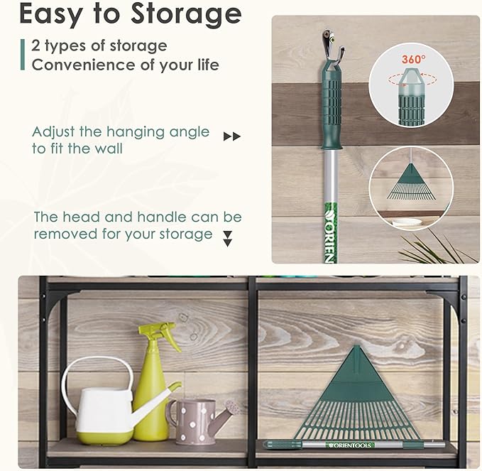 - MULTIFUNCTION HANDLE: Our garden rake can adjust the handle from 42 inches to 60 inches. By adjusting the height of the handle, you can customize the length of the handle to your needs, thus providing optimal comfort and convenience during use. The non-slip grip can rotate 360 degrees and hang up conveniently.