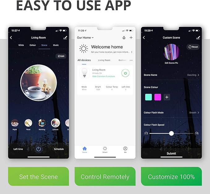 - ✅ EASY TO USE APP - Control from your smartphone or tablet with the user-friendly Smart Life or TUYA apps. Note: Bluetooth, Location, and 2.4 GHz WiFi signal required for pairing. Not compatible with dimmer switches. Multiple bulbs must be paired one bulb at a time.